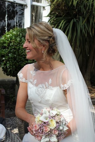 Julie is wearing a Ivory Chantilly lace fishtale Kathy De Stafford gown.Julie travelled from Kanturk,Co.Cork. She enjoyed her wedding reception in Sneem Hotel.. Stunning. |